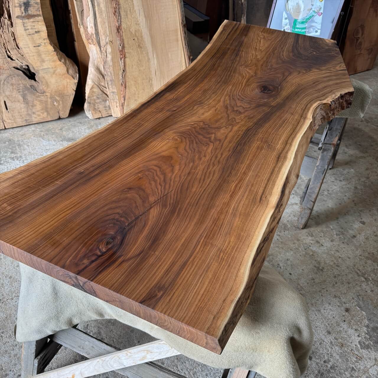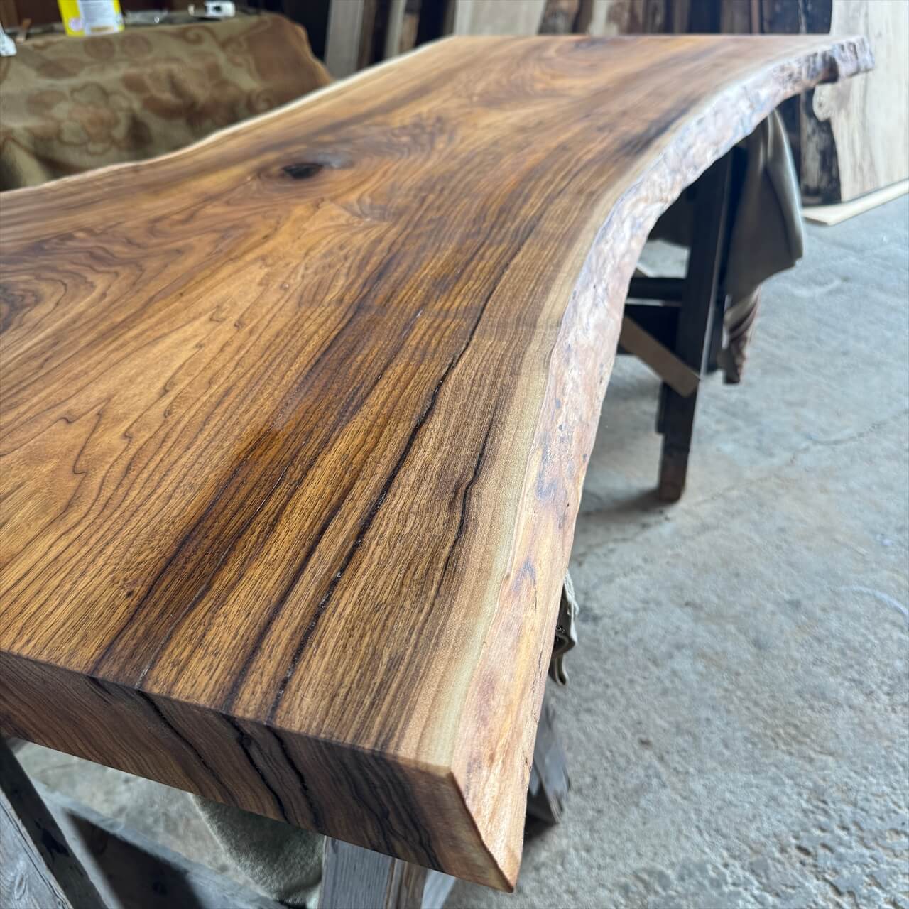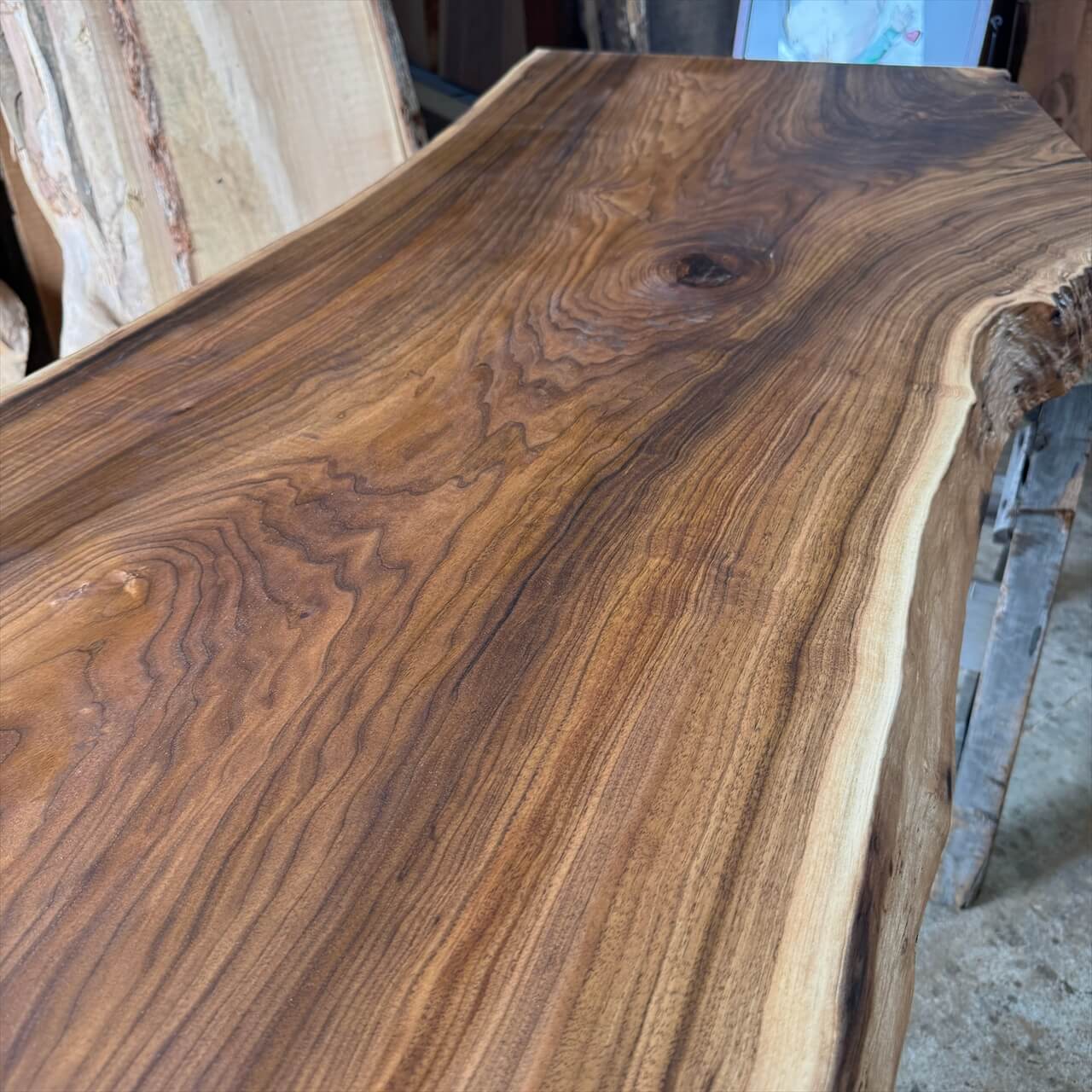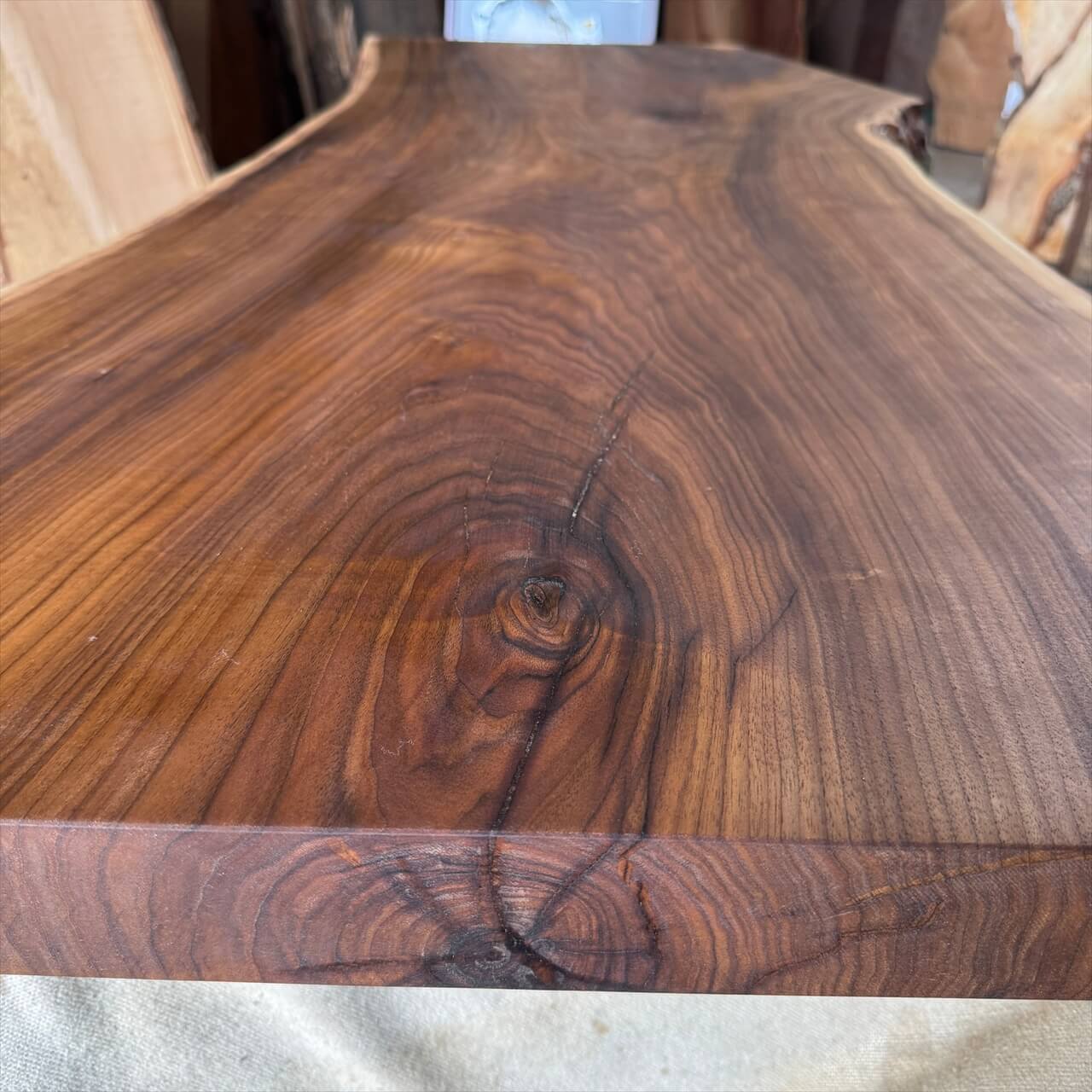 非常に色が濃く、一般的なオニグルミでは滅多に見られない深い赤身を持った一枚板になります。茶褐色から黒褐色へグラデーションが広がり、自然が描いた絵画のような存在感を放ちます。