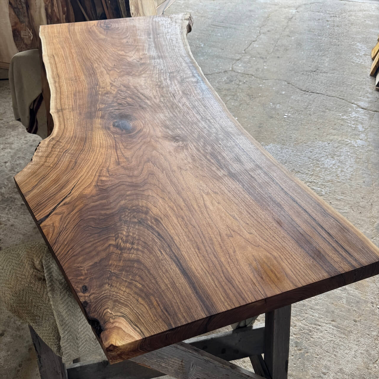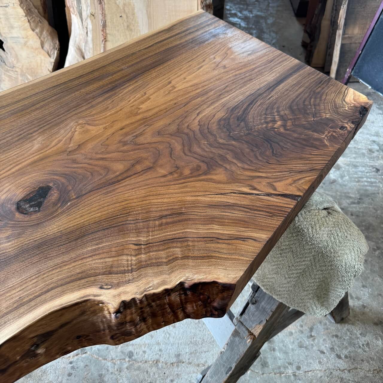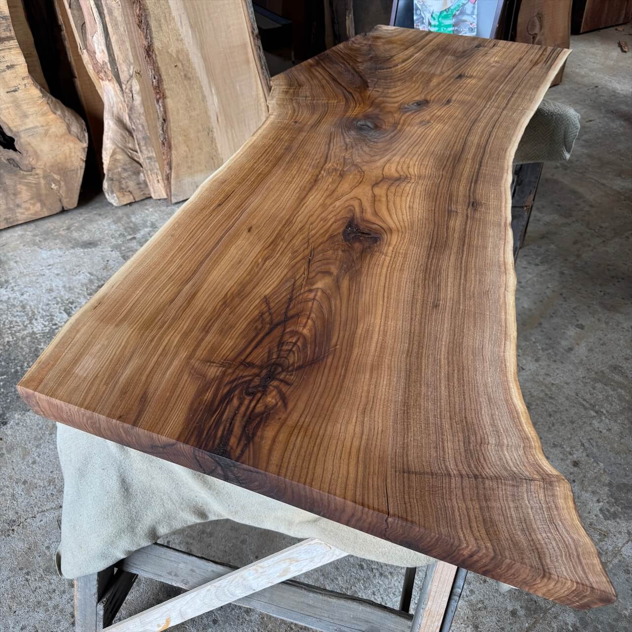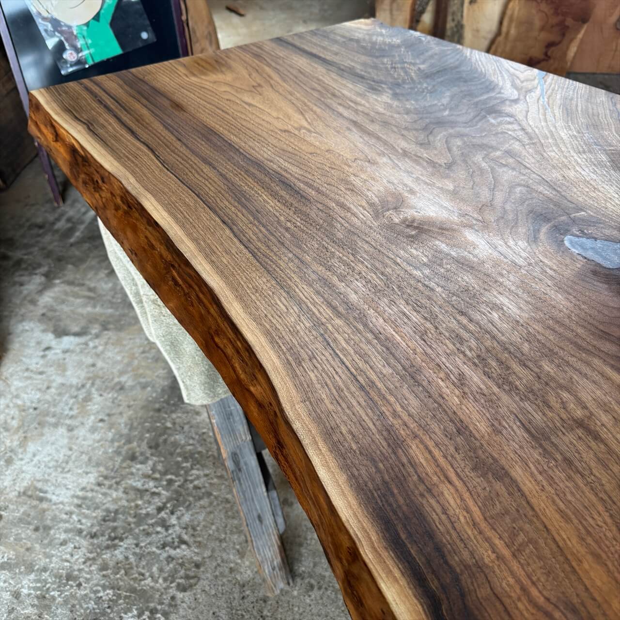 非常に色が濃く、一般的なオニグルミでは滅多に見られない深い赤身を持った一枚板になります。茶褐色から黒褐色へグラデーションが広がり、自然が描いた絵画のような存在感を放ちます。