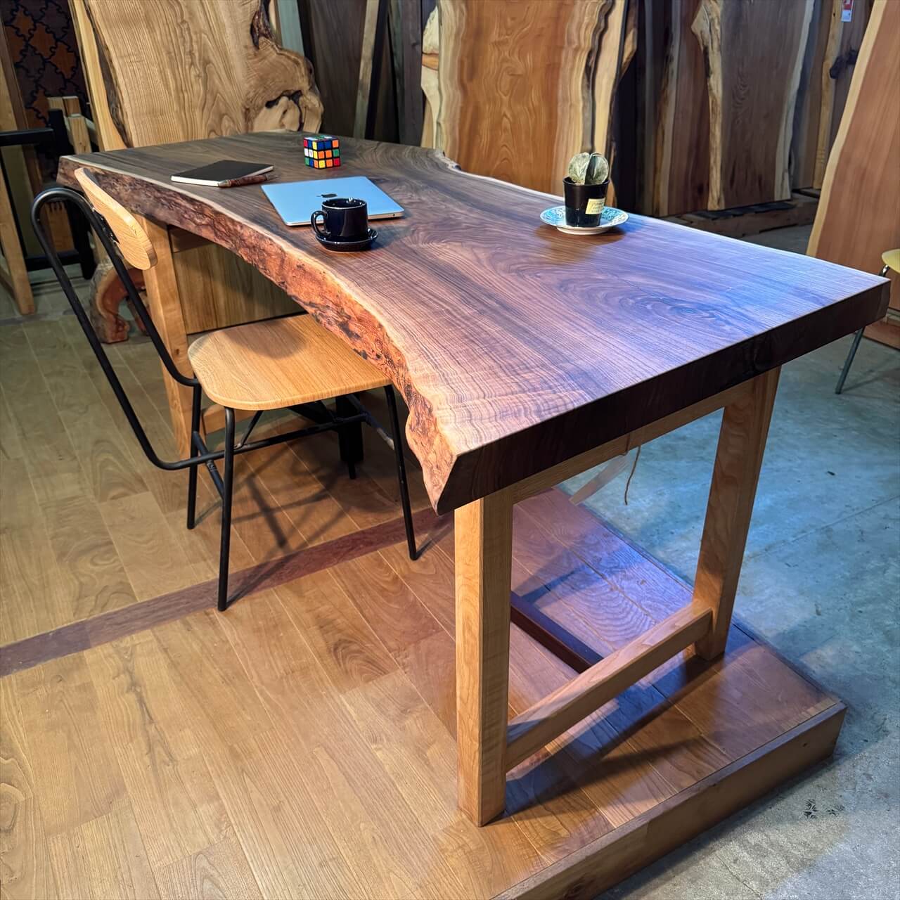 空間の主役として強い印象を残します。無垢材の魅力を楽しむインテリアにおすすめです。世界に二つとない色味と風合いを持つ、特別なオニグルミ一枚板です。