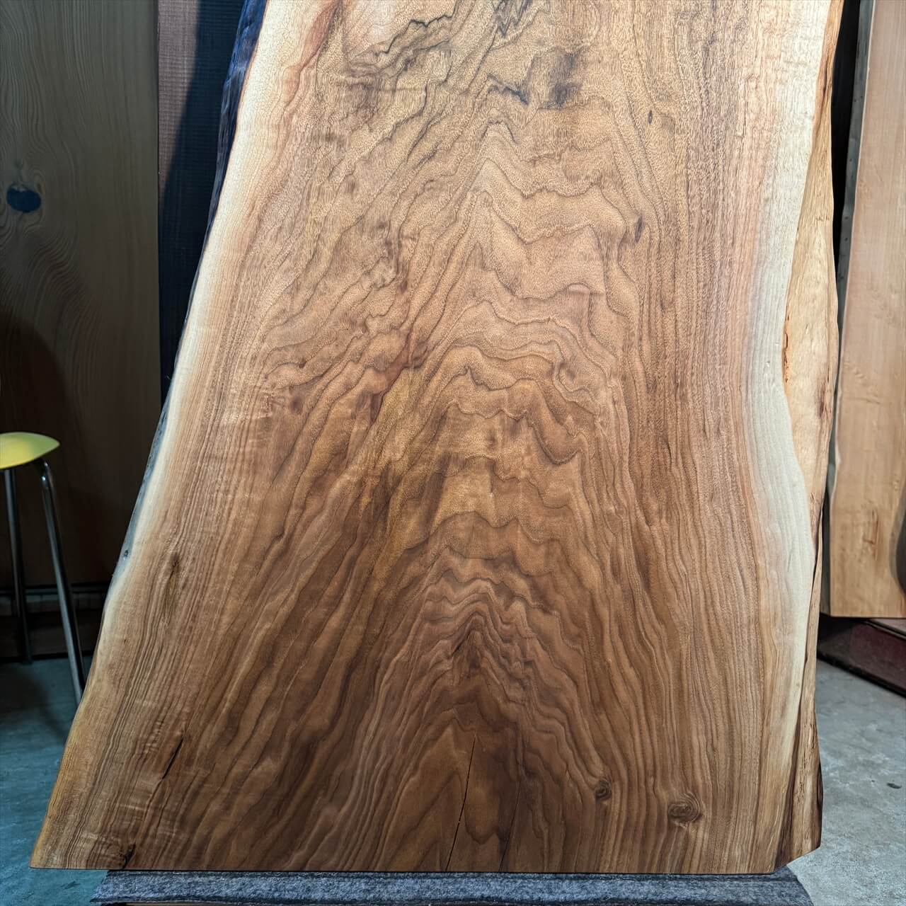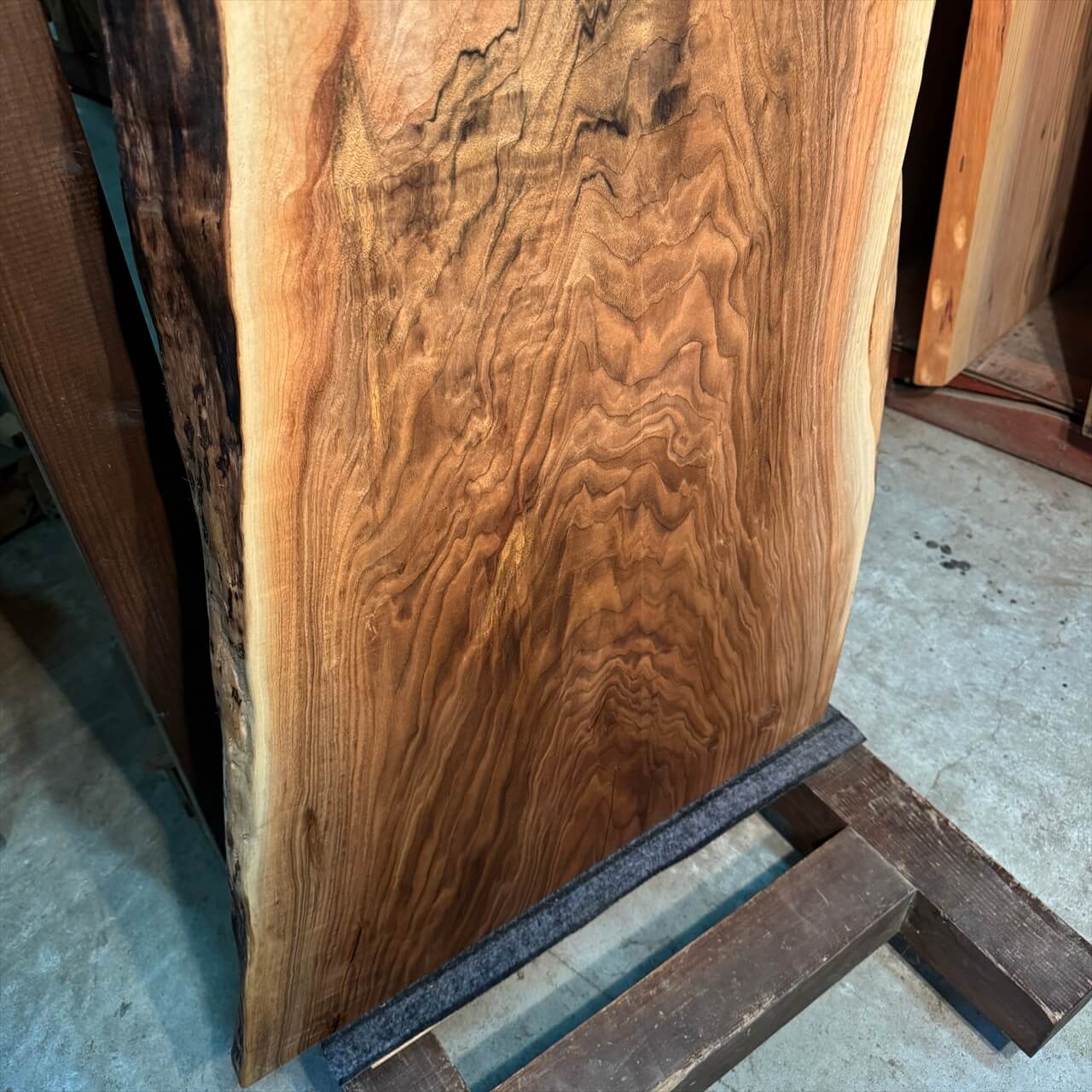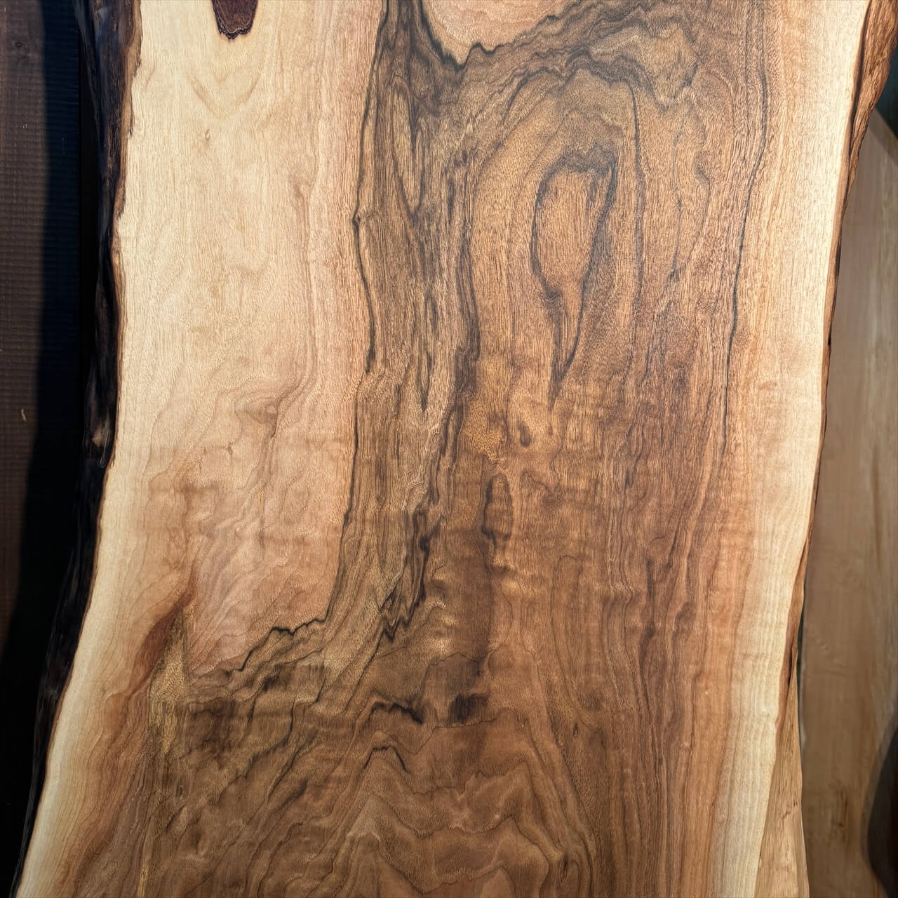 オニグルミの中でも珍しい独特の“濃さ”を纏った色味がひと目で目を惹きつけ、赤身と白太が描く力強いコントラストが抜群の存在感を放ちます。