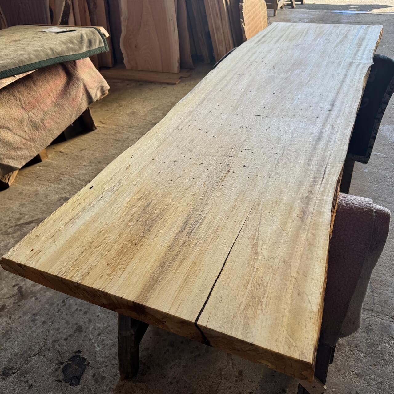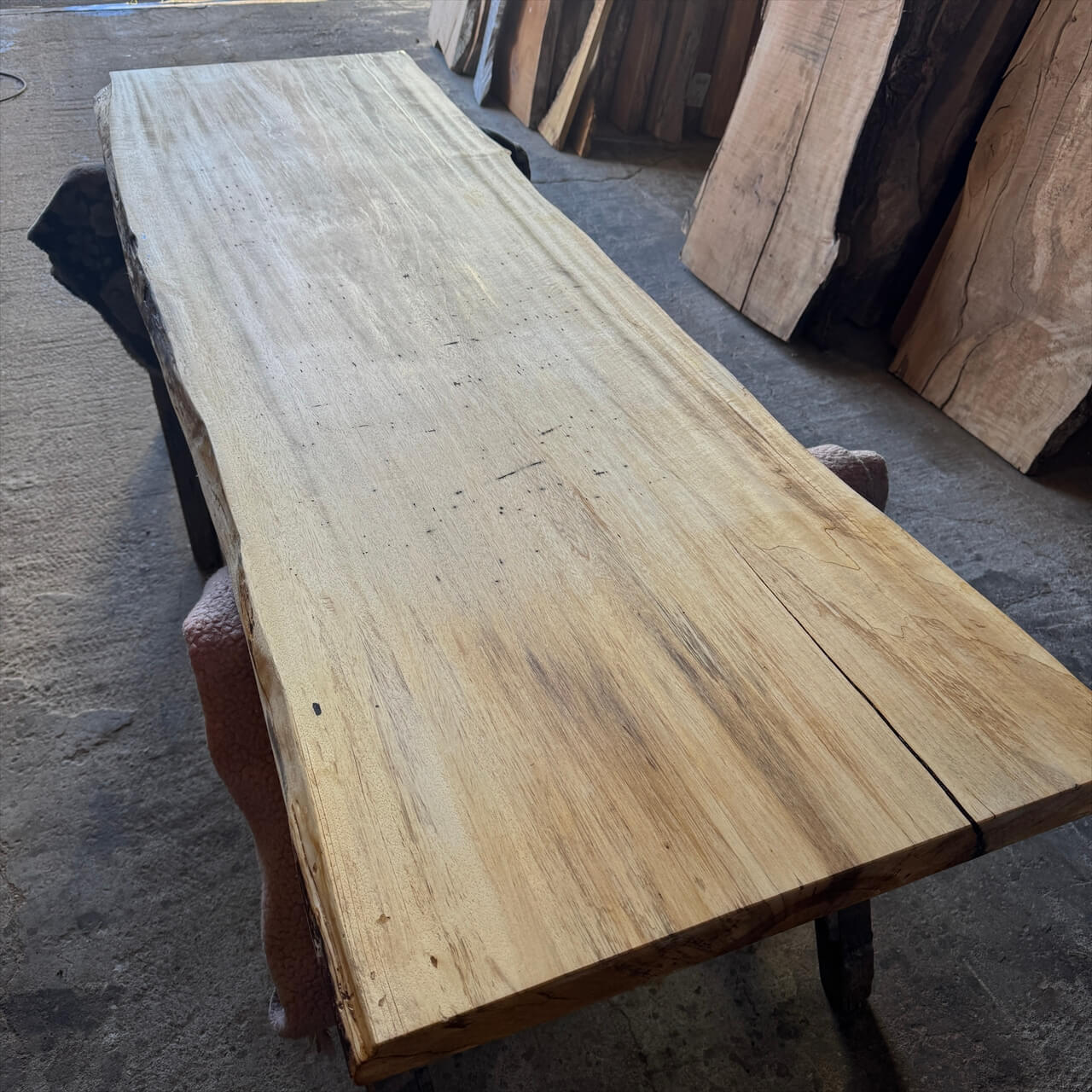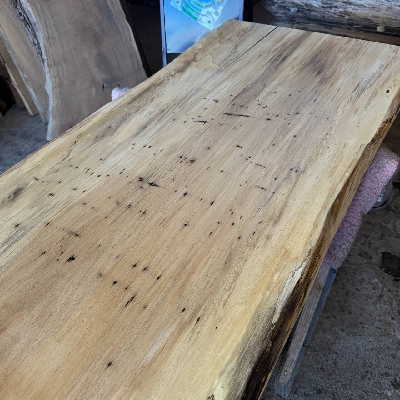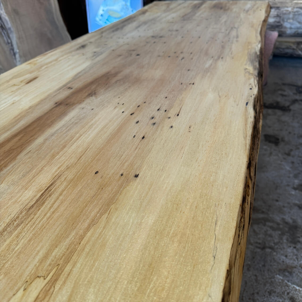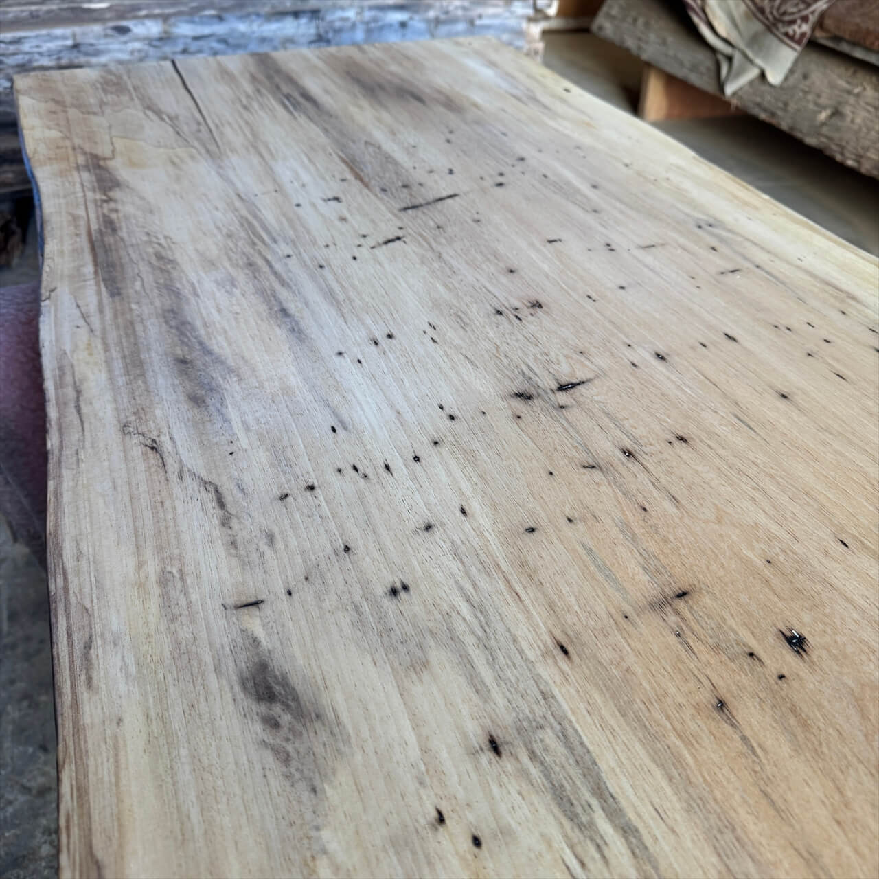 こちらの一枚板は、淡く年輪もみえないシンプルな大面に少しの赤身やスポルテッド、青シミ、そして無数のソバカスが散りばめられ、景色を構成しています。