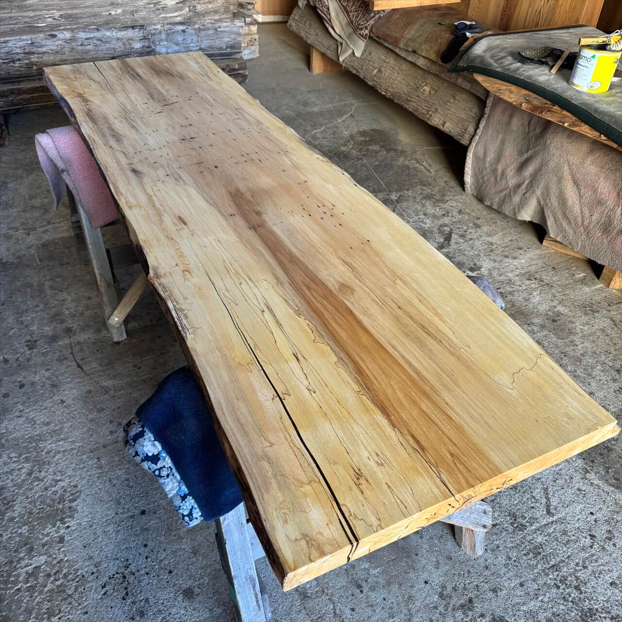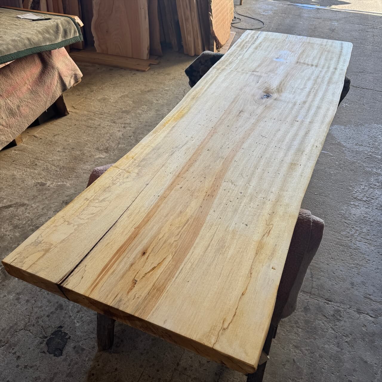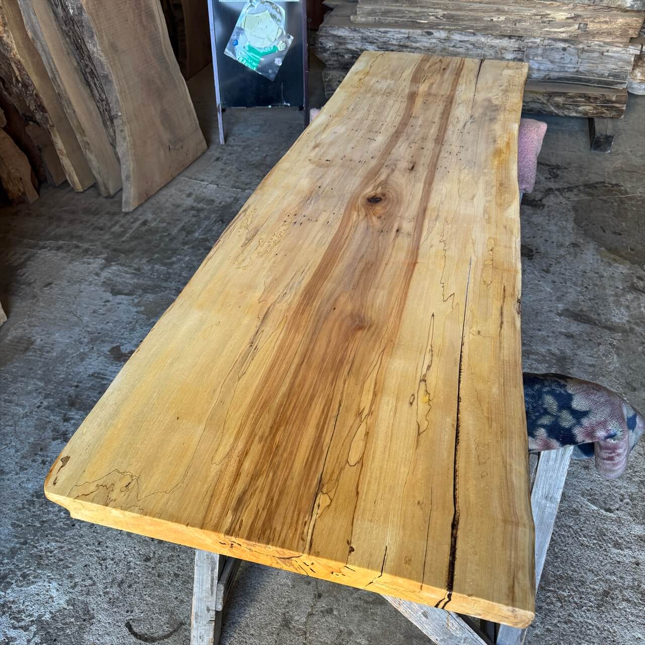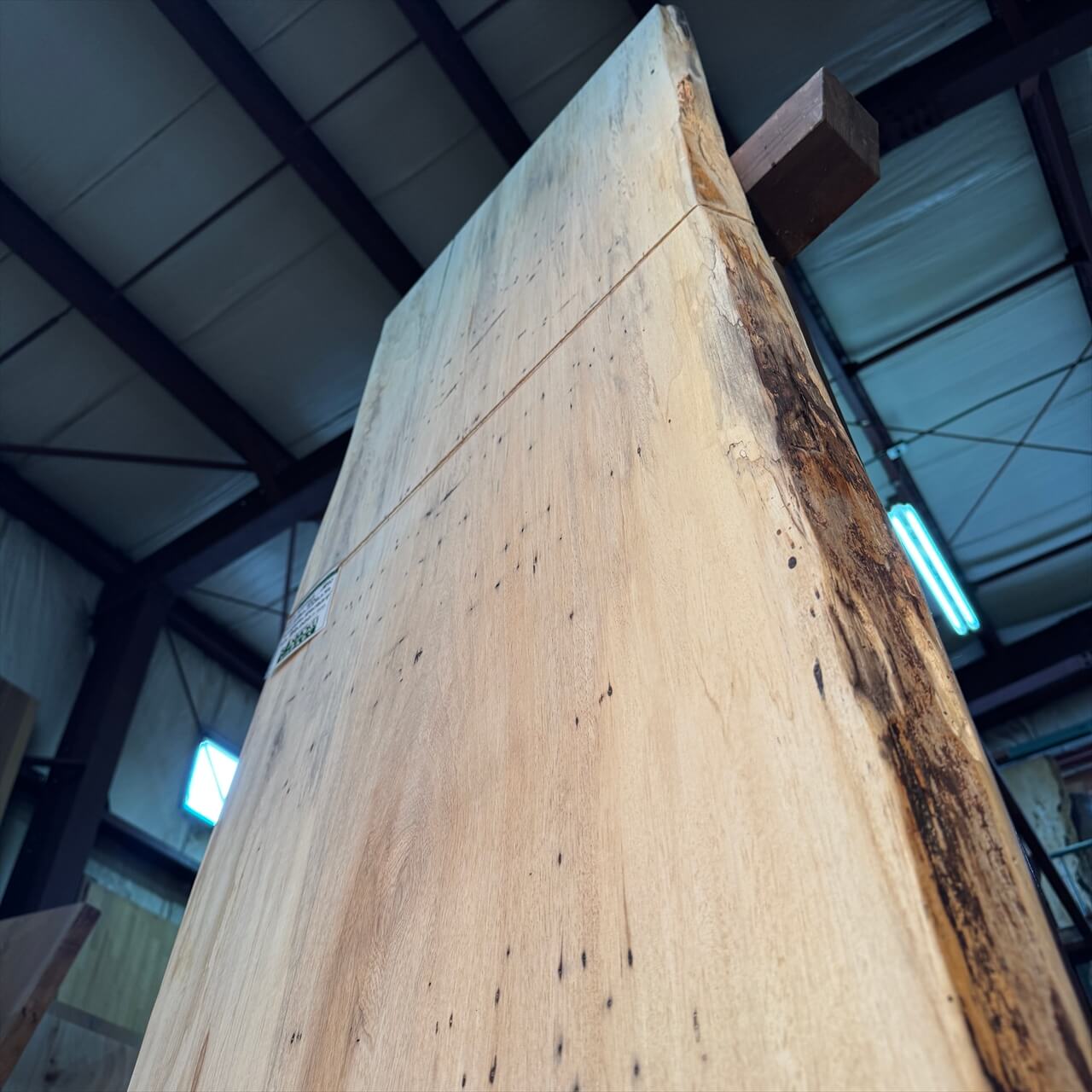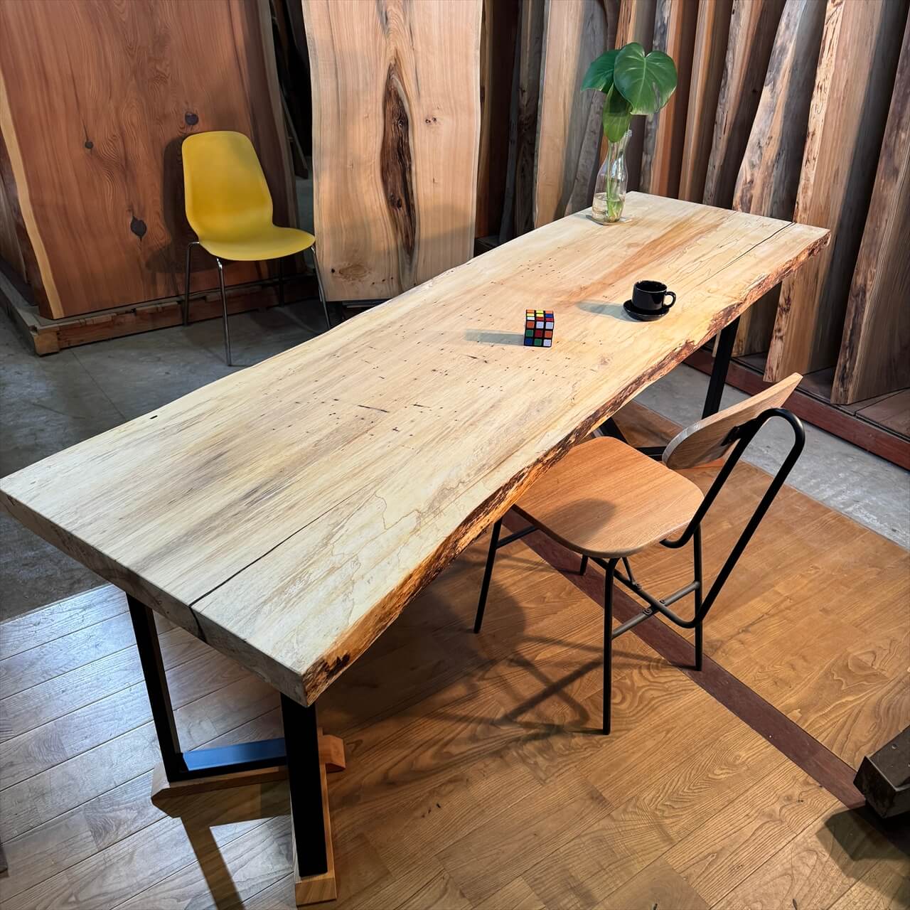 こちらの一枚板は、淡く年輪もみえないシンプルな大面に少しの赤身やスポルテッド、青シミ、そして無数のソバカスが散りばめられ、景色を構成しています。