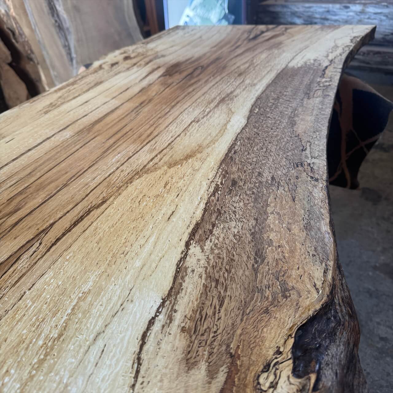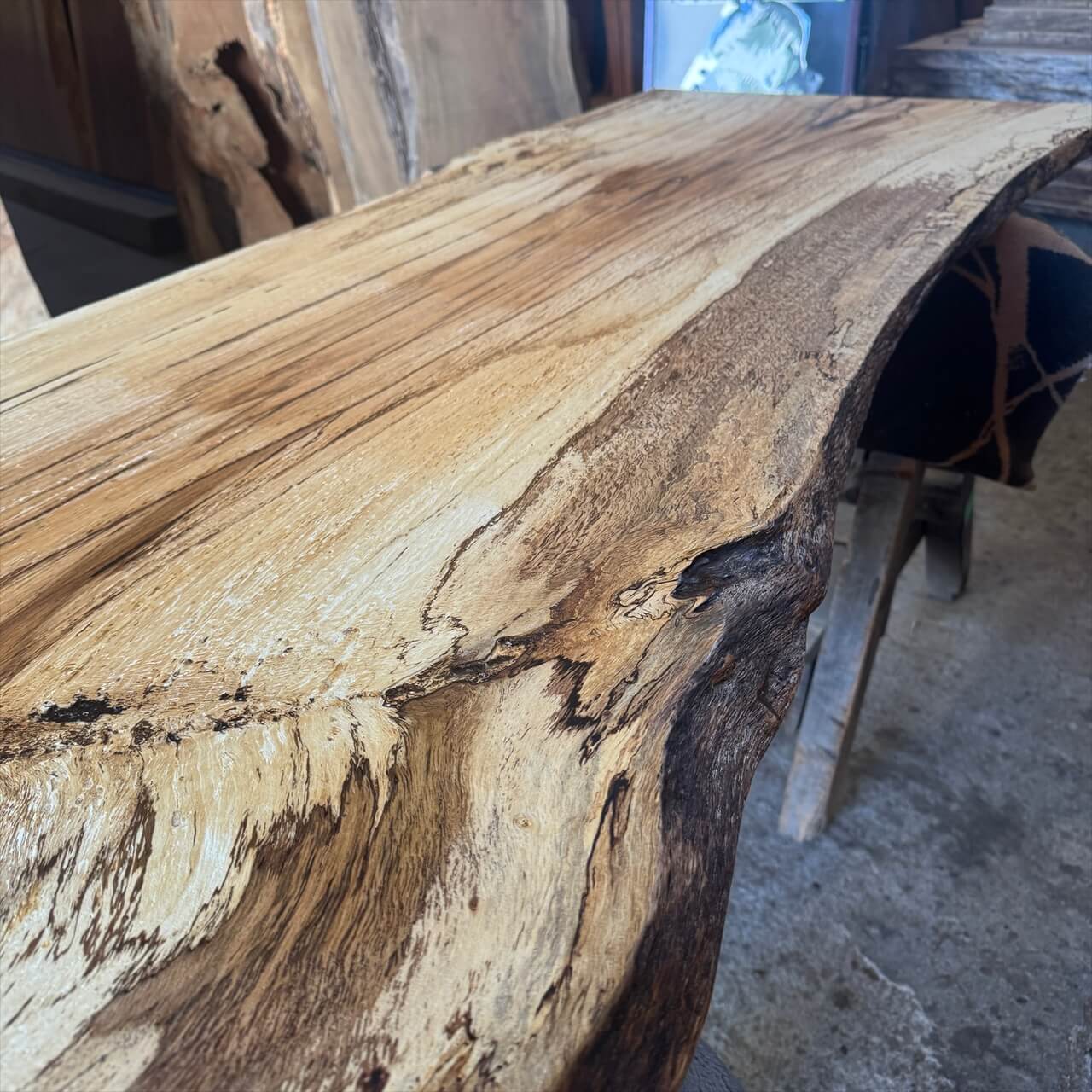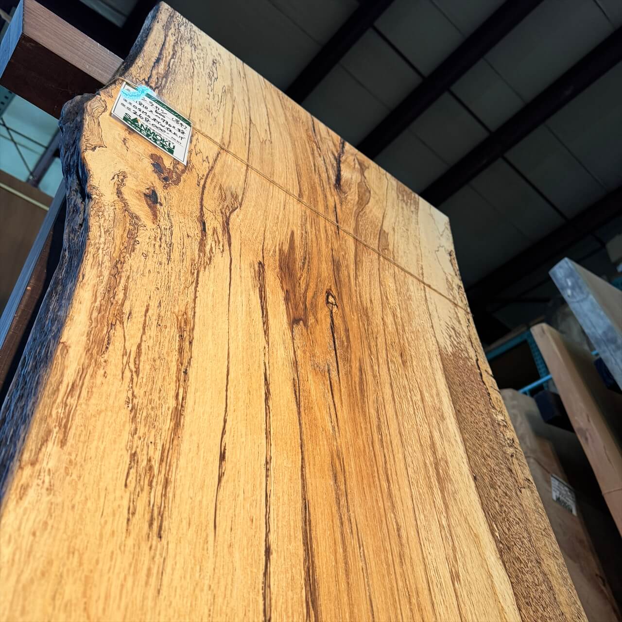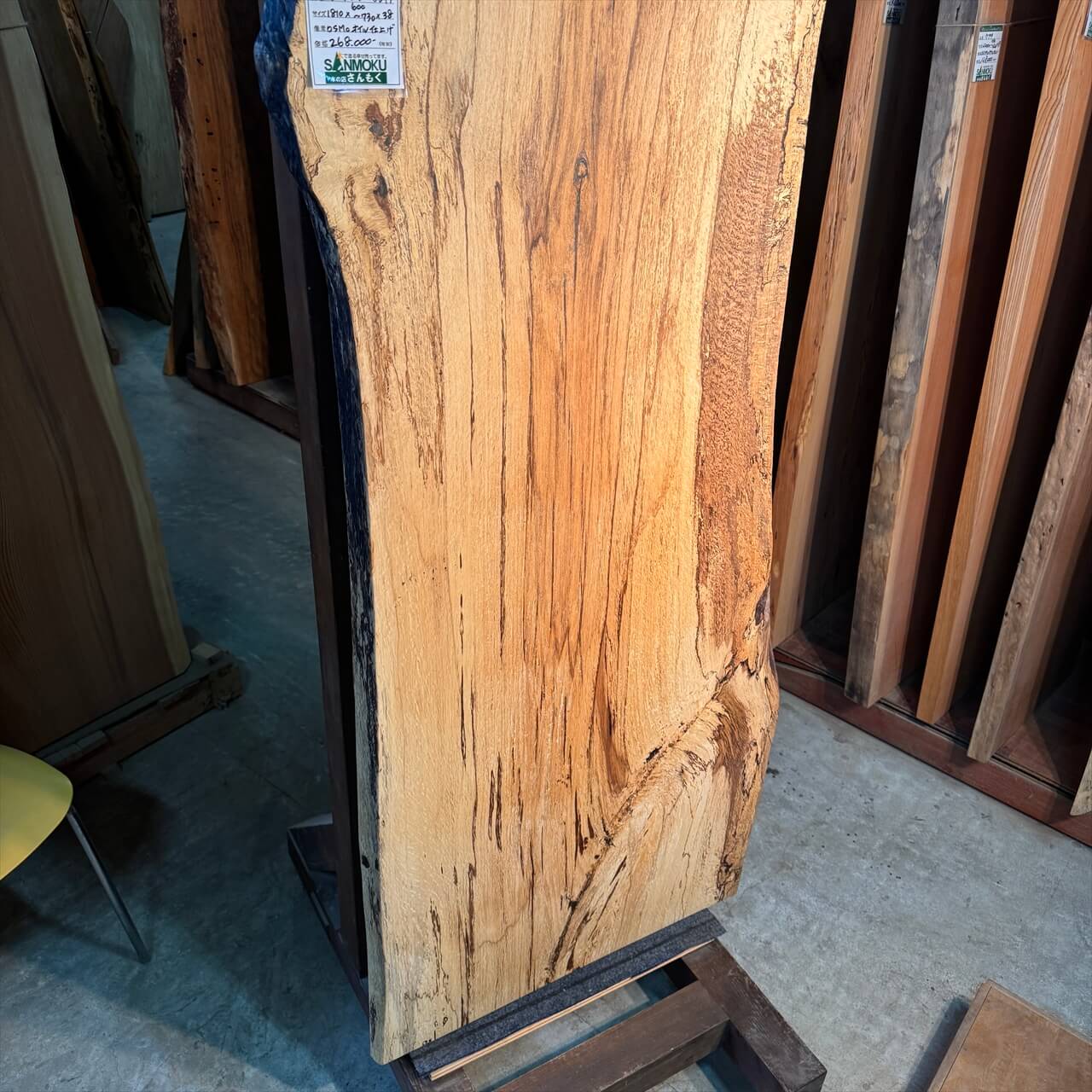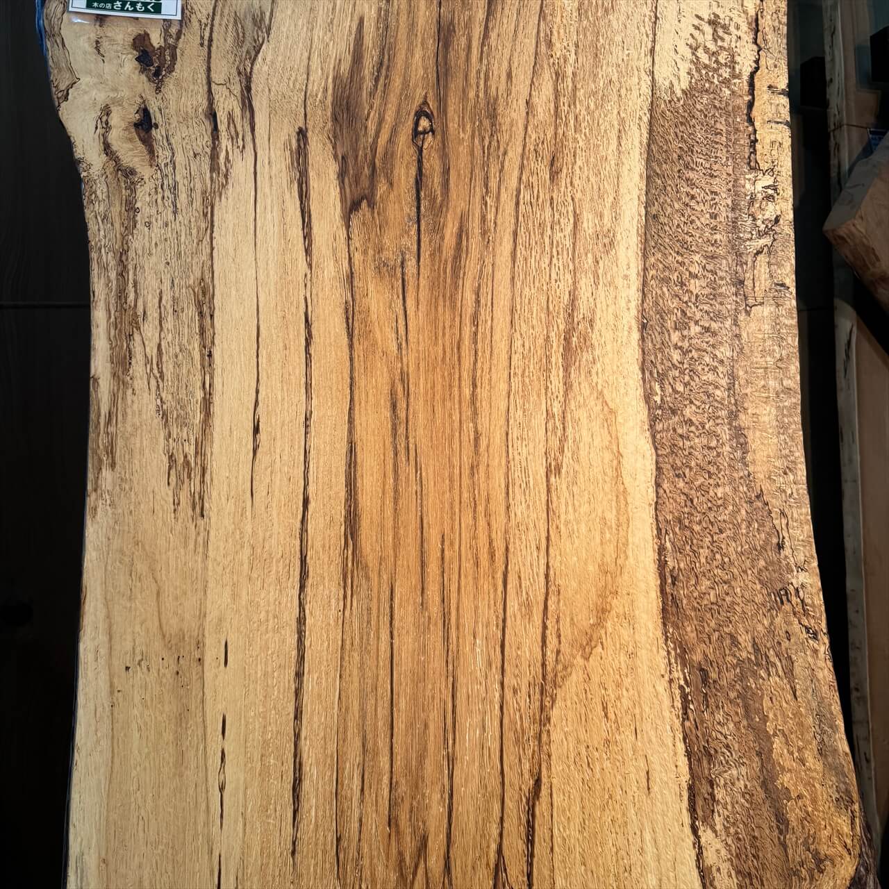 原木を製材したときから一枚板にしるされた熟成の跡、濃いシミや腐朽菌が紋様になった「スポルテッド」が前面にあらわれていて、普通の一枚板とは一線を画す独特な雰囲気の一枚板です。