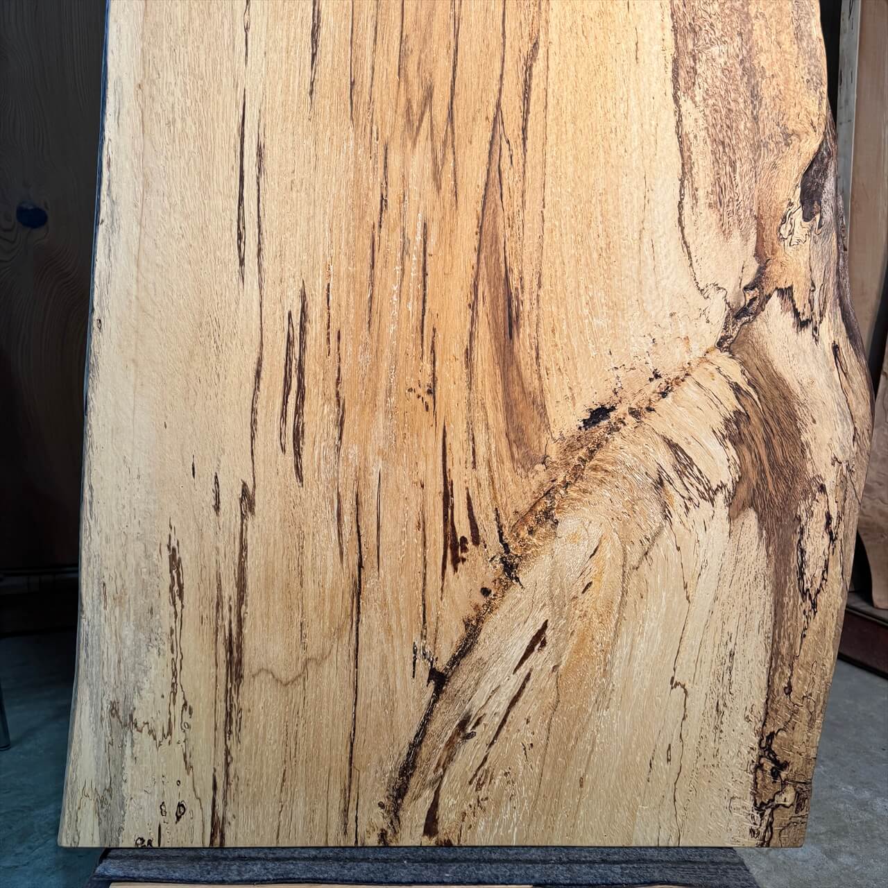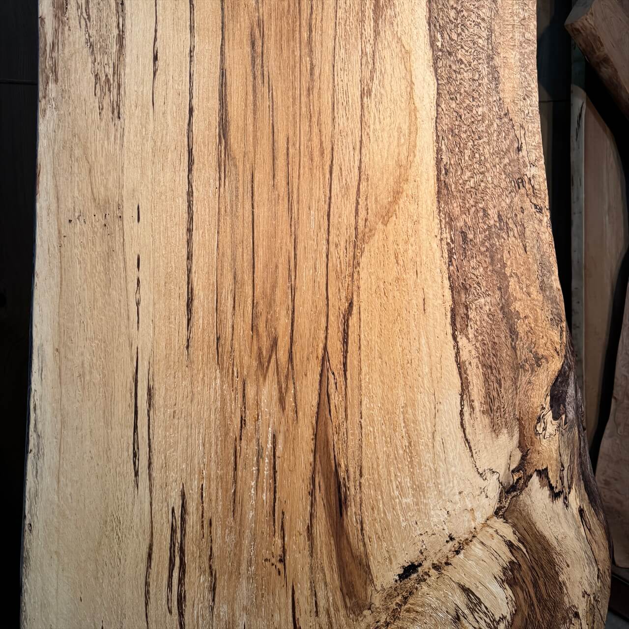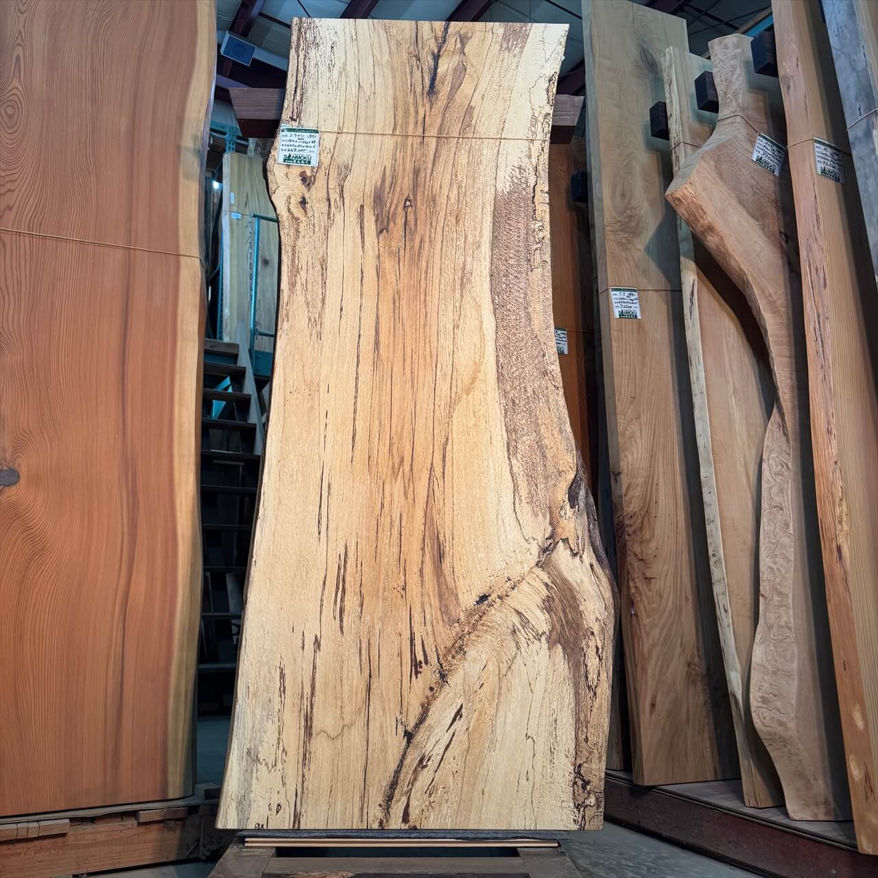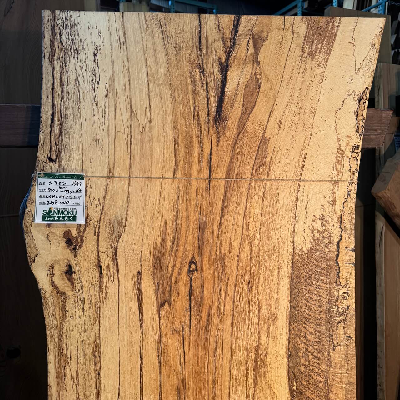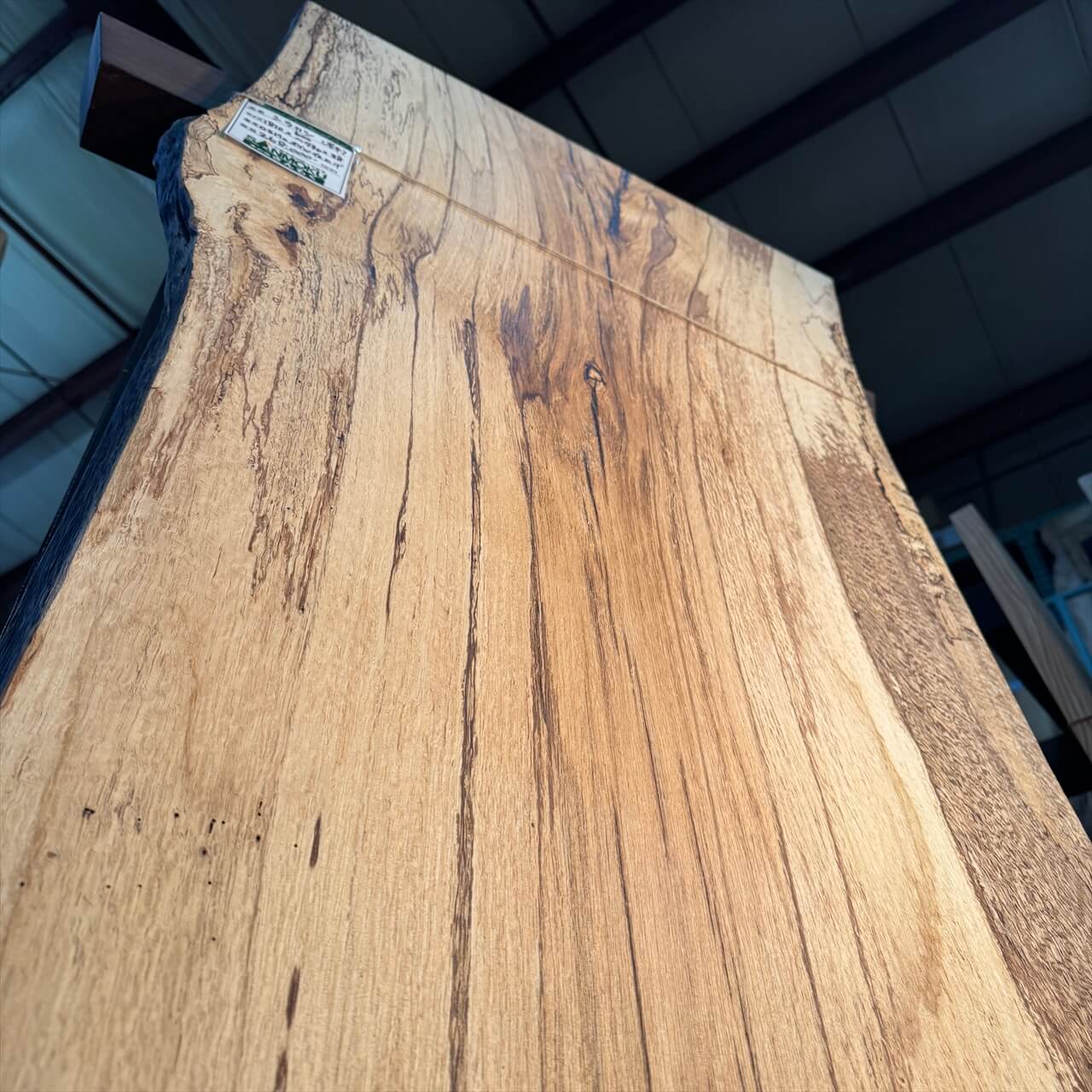 原木を製材したときから一枚板にしるされた熟成の跡、濃いシミや腐朽菌が紋様になった「スポルテッド」が前面にあらわれていて、普通の一枚板とは一線を画す独特な雰囲気の一枚板です。