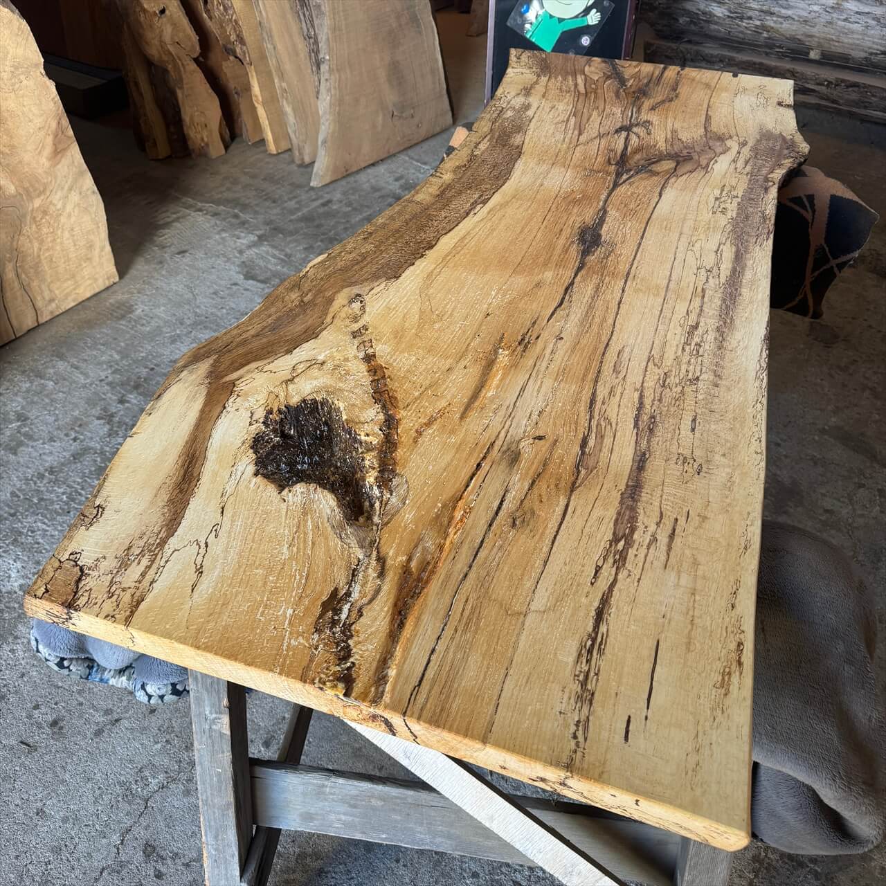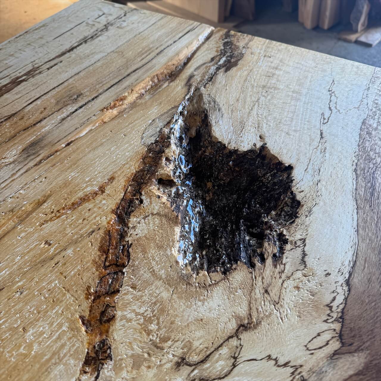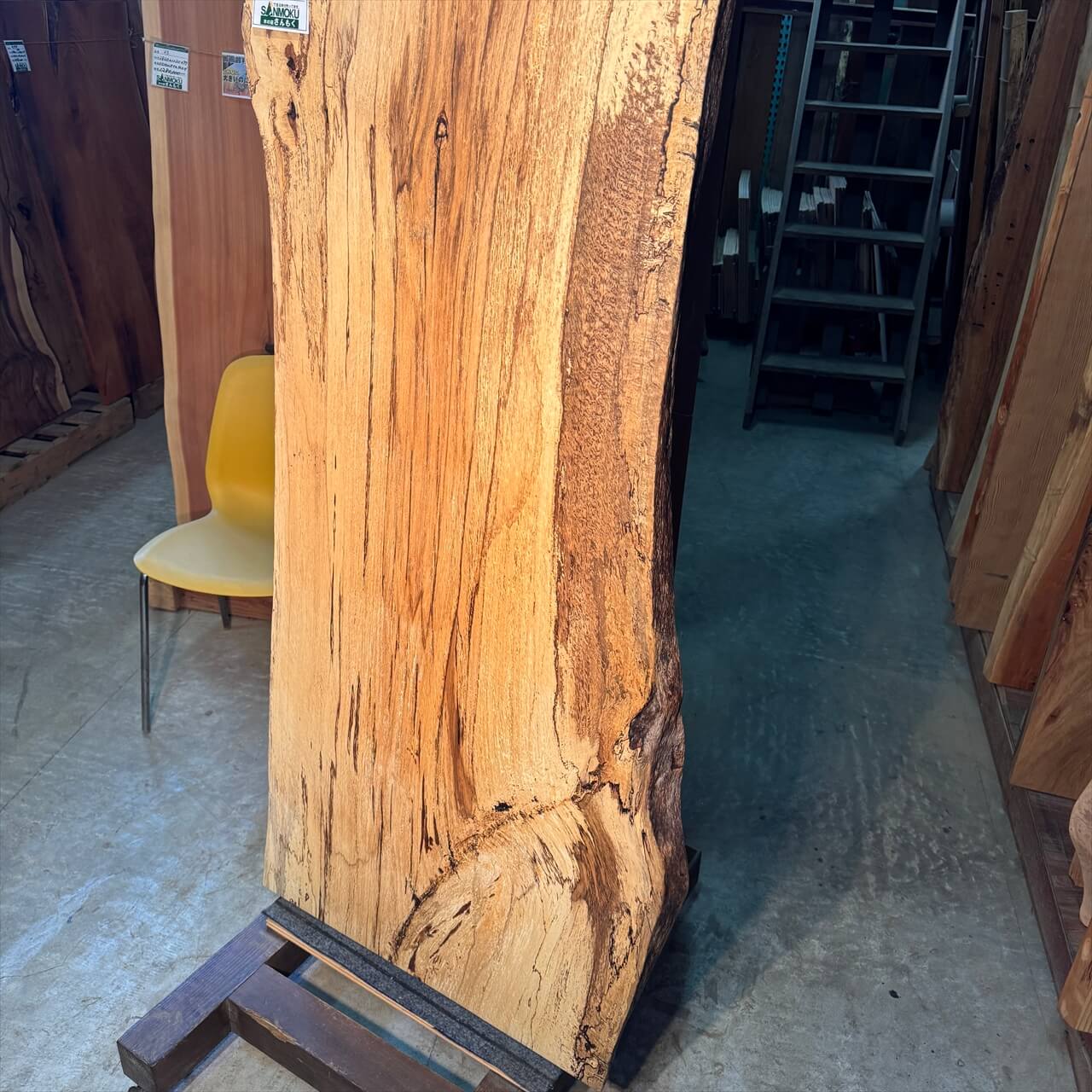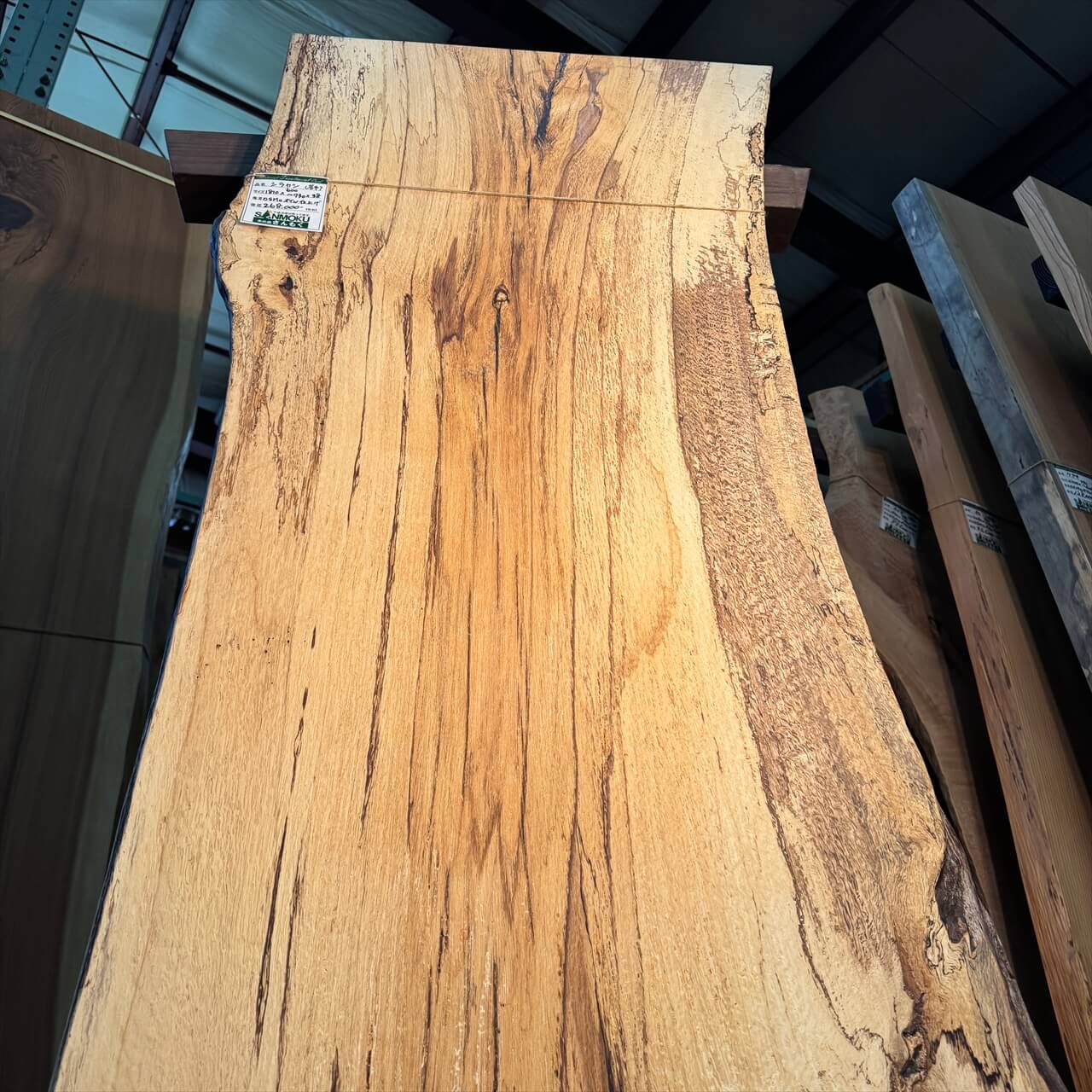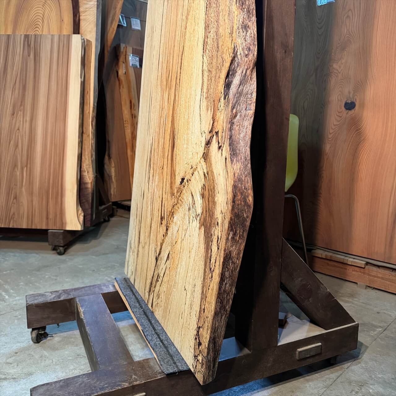 原木を製材したときから一枚板にしるされた熟成の跡、濃いシミや腐朽菌が紋様になった「スポルテッド」が前面にあらわれていて、普通の一枚板とは一線を画す独特な雰囲気の一枚板です。