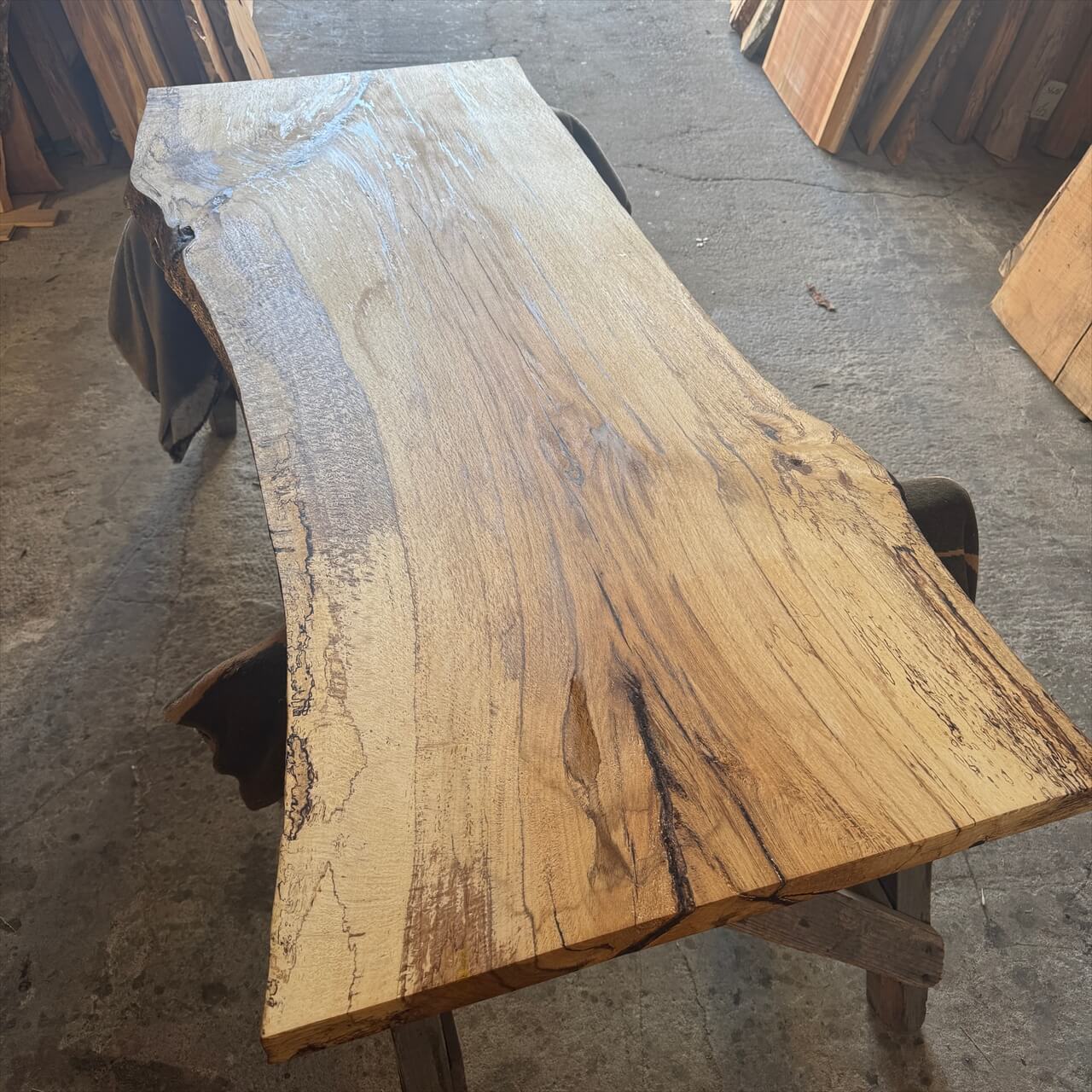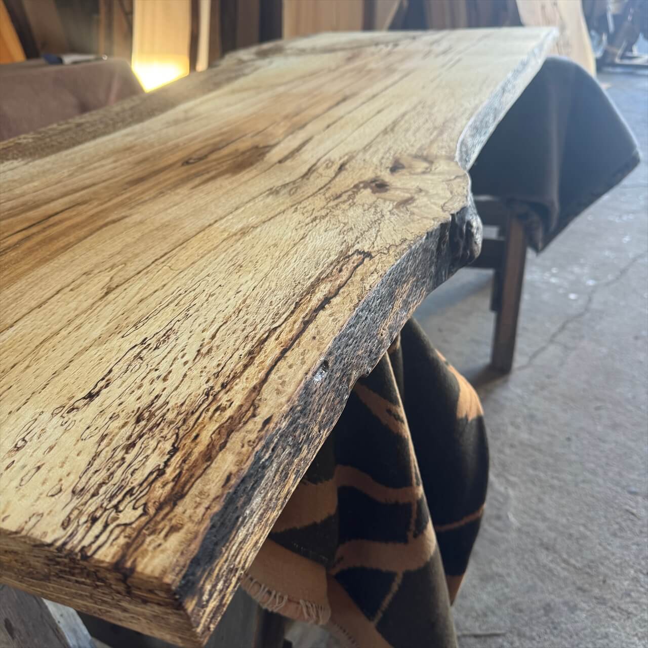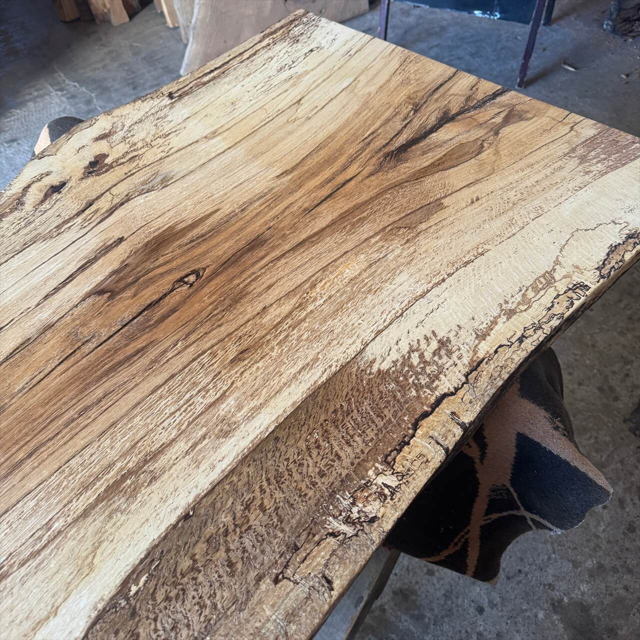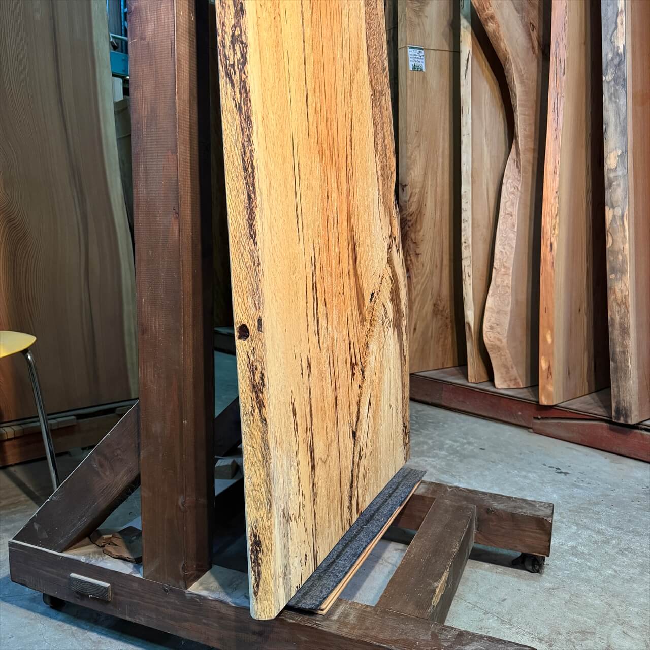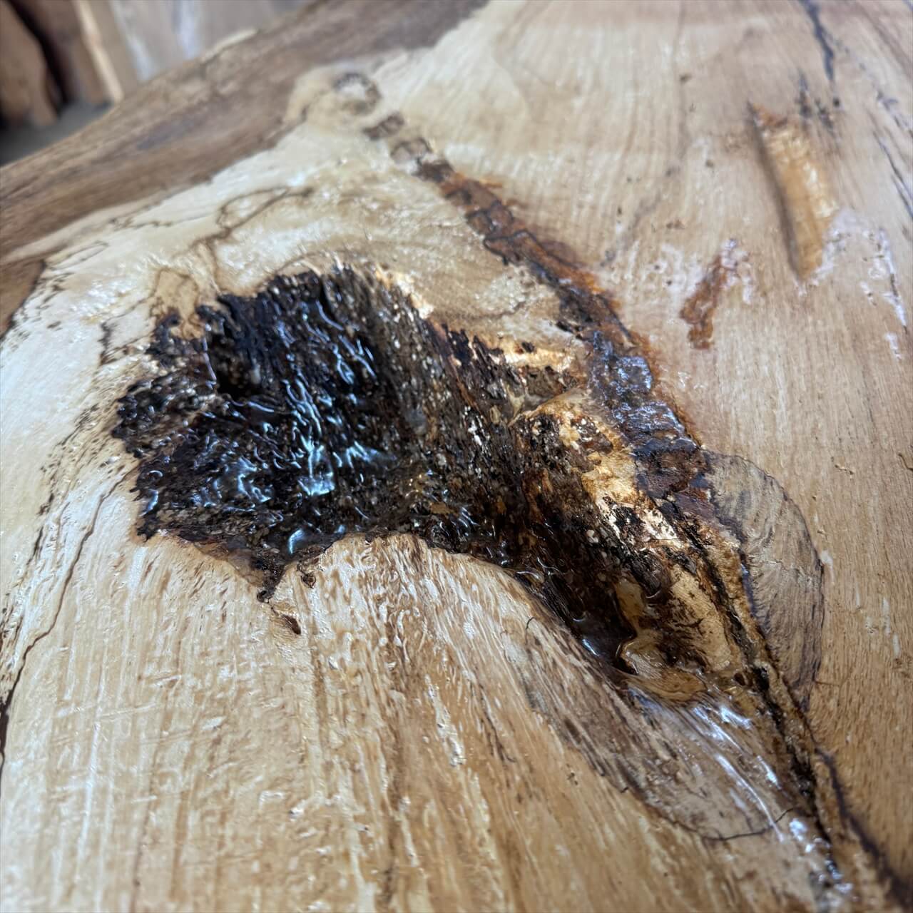 原木を製材したときから一枚板にしるされた熟成の跡、濃いシミや腐朽菌が紋様になった「スポルテッド」が前面にあらわれていて、普通の一枚板とは一線を画す独特な雰囲気の一枚板です。
