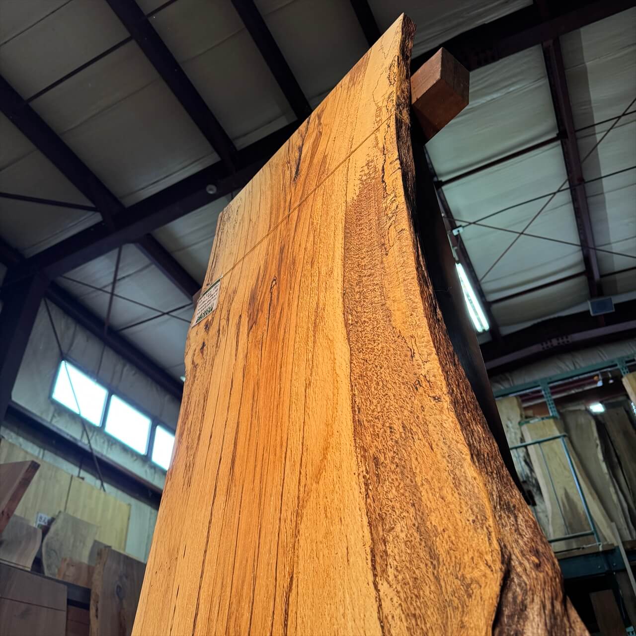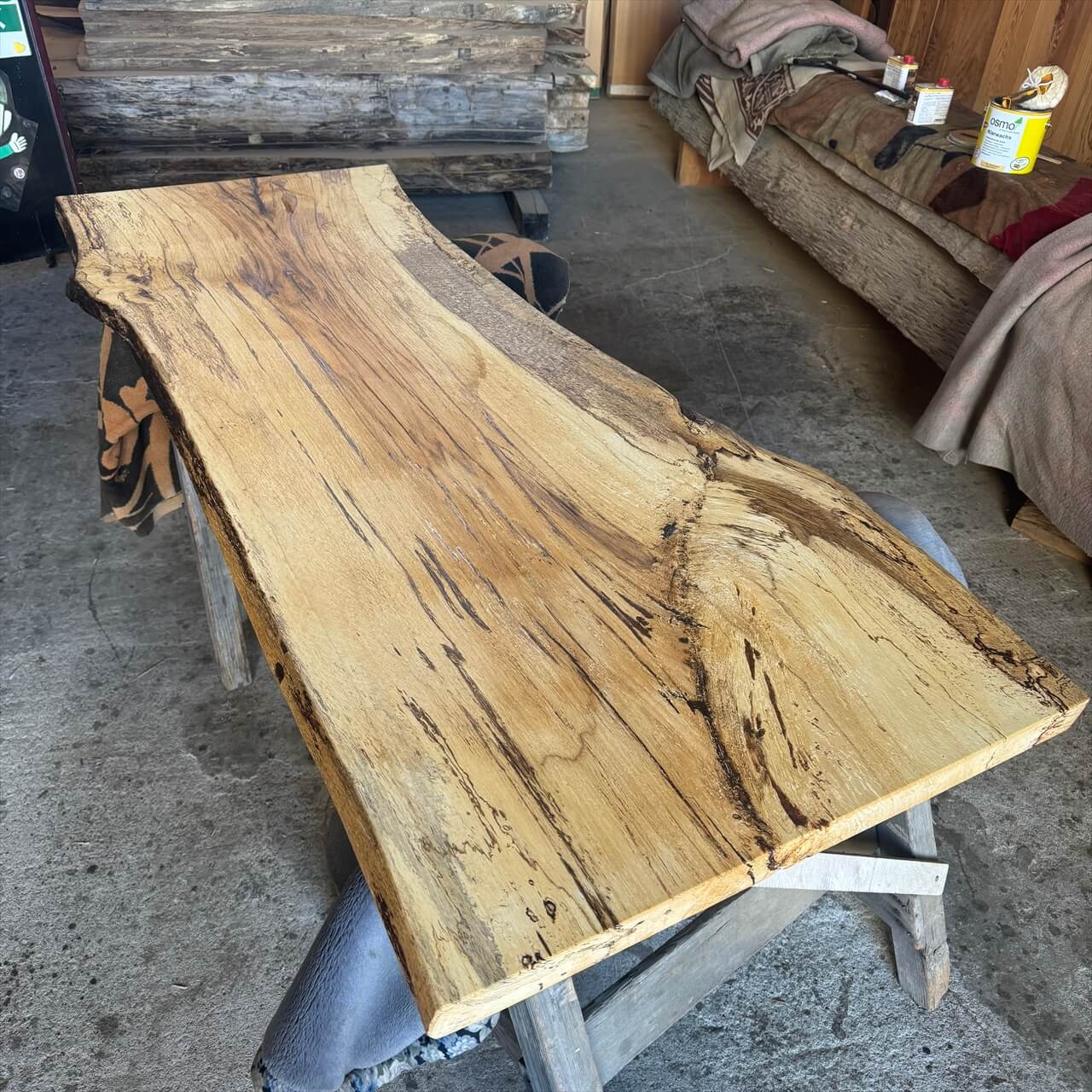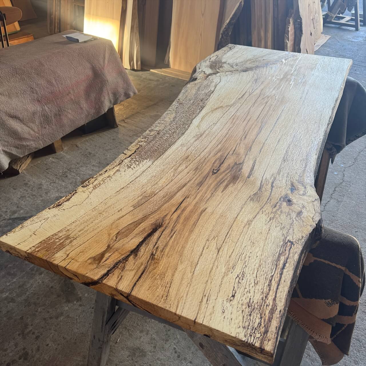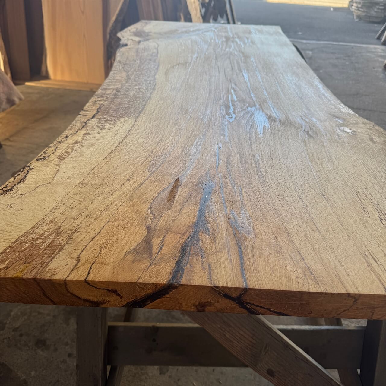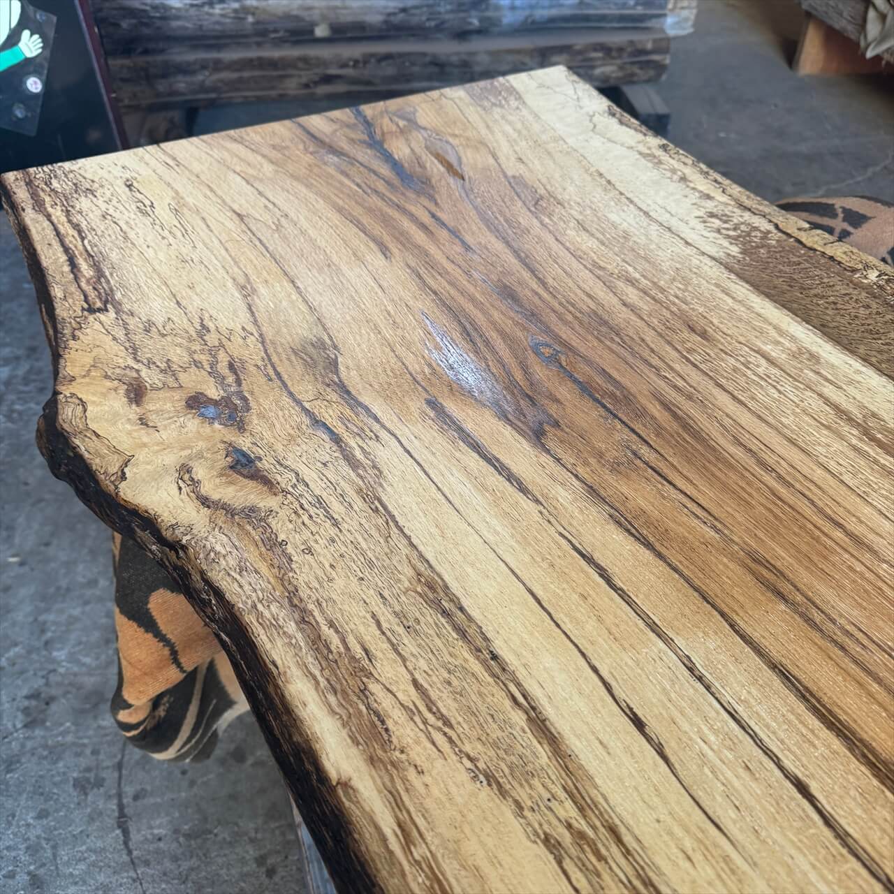 原木を製材したときから一枚板にしるされた熟成の跡、濃いシミや腐朽菌が紋様になった「スポルテッド」が前面にあらわれていて、普通の一枚板とは一線を画す独特な雰囲気の一枚板です。