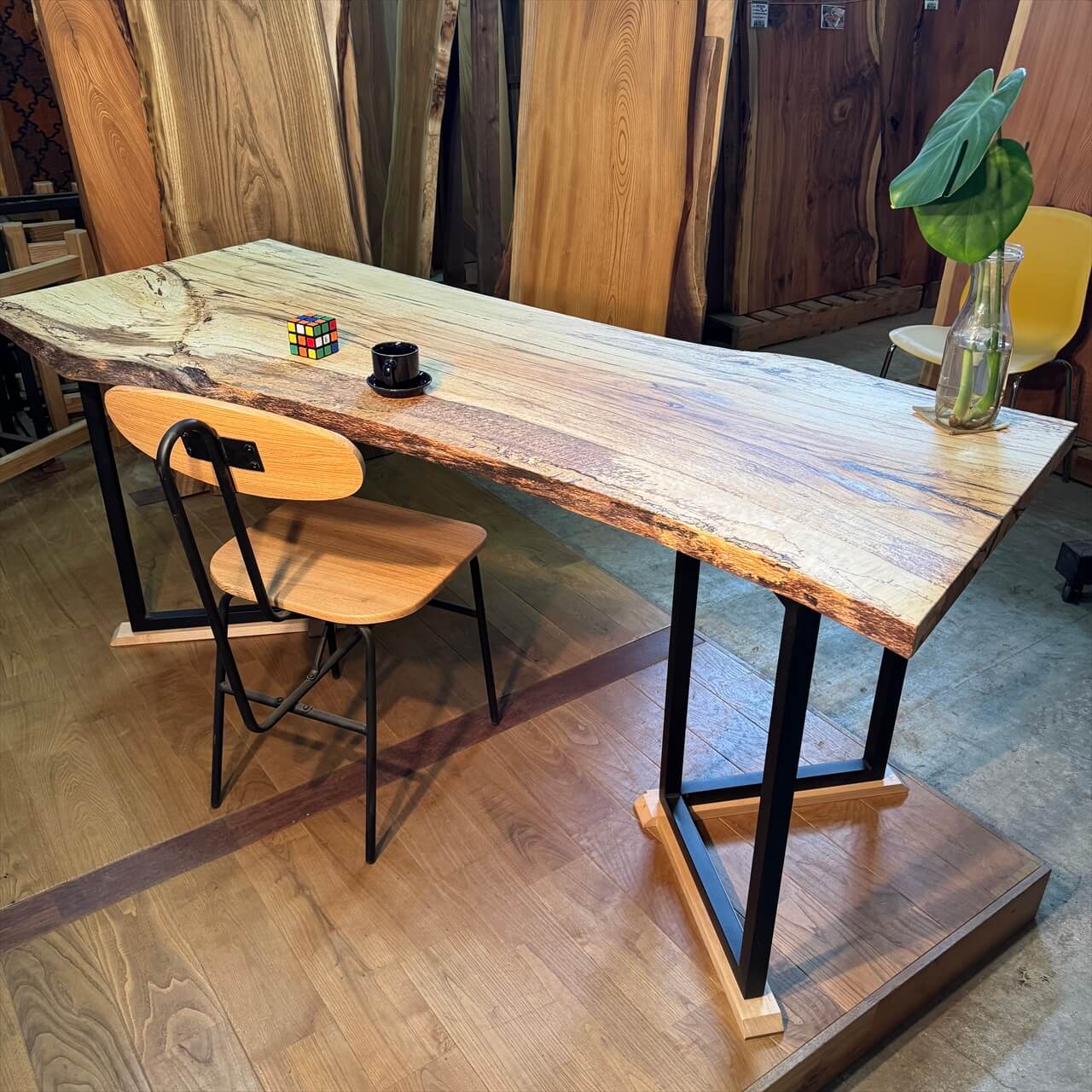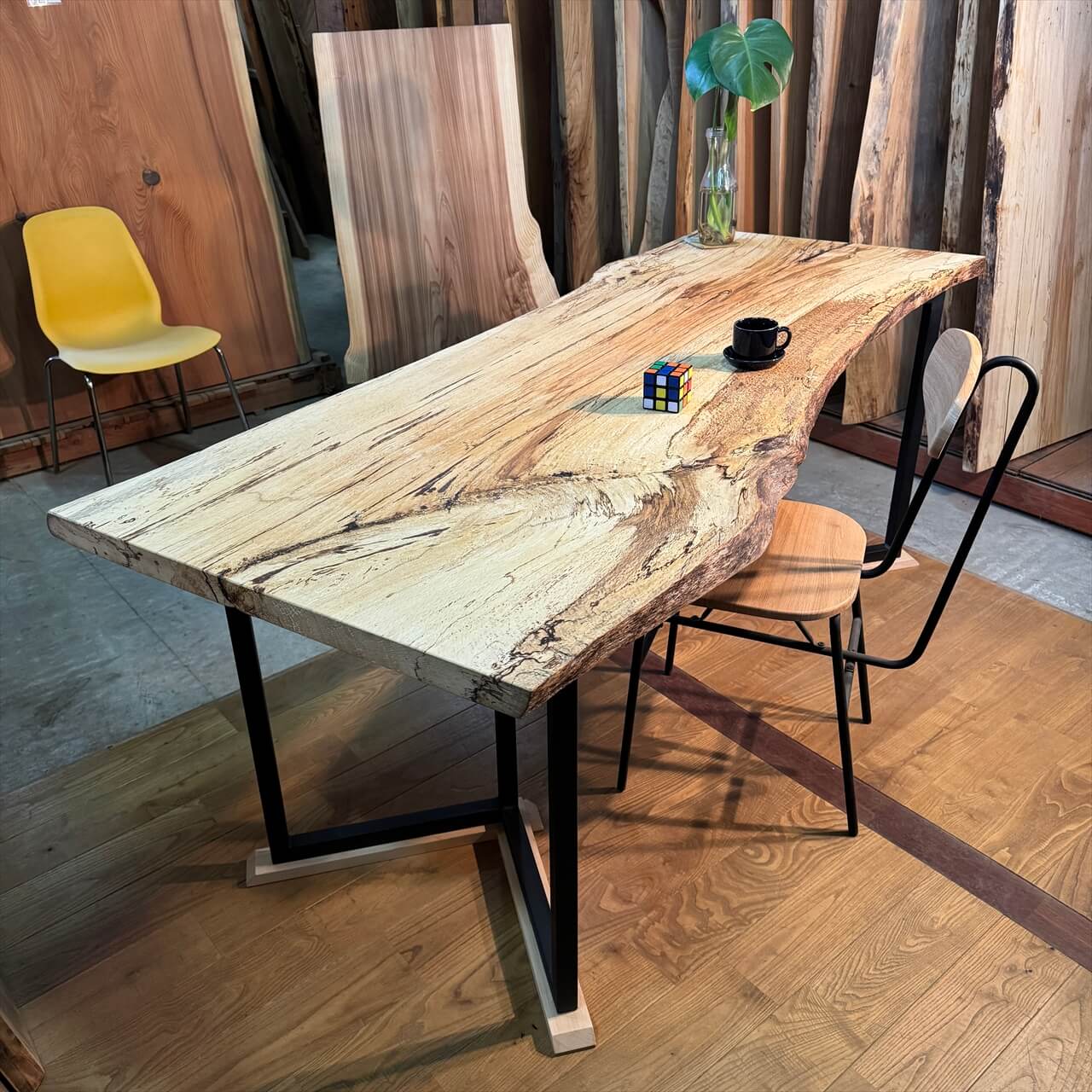 焦げたような耳も一枚板の形をしっかり浮き立たせ、材面に負けないよう主張しています。